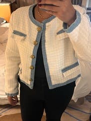 The denim trim made it challenging for me personally to style this jacket bc I don't like mixing shades of denim. Black pants like felt too much contrast bc this jacket is basically pure white. I ended up wearing this with jeans and buttoning it completely, more like a top. This got tons of compliments at work! This was cute, but not the most useful item for me!