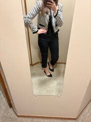 Perfect jacket to wear to work. I wore it several times, comfy, didn’t wrinkle. It is black stripes and not navy if you can’t tell in photo.