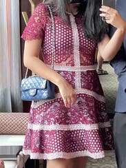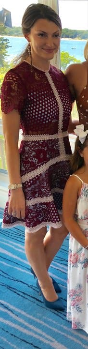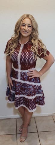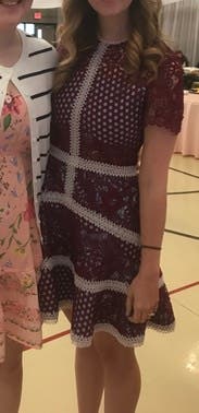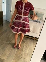 Dress was beautiful and heavy (in a good quality kind if way). I receievd so many compliments. Even with the shorter length it was still perfect for a formal wedding. I love Alexis everything and this dress lived up to the standards. I usually wear a 4 or 6 in a dress, and although you cant tell in this picture the dress hung loosely. It was the look i wanted but if you want a tight, body hugging lace dress i would size down.