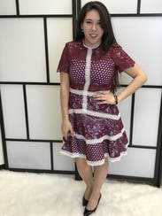 Lovely lace! Running true to size, we suggest sizing up for backup due to the fitted bust and natural waist. The fabric also has no stretch, so we recommend for A to C cup sizes. I wore the size M and it was a perfect fit! Due to the lace detailing on top, this style should be worn with a strapless bra. The midsection is sheer, which adds a bit of edge to the look! I would pair this look with cute studs and a high ponytail to complete the look.