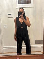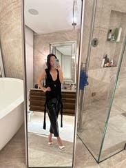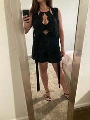 I rented a small, but it was still pretty loose in the chest area even though I’m a DD. I decided to style it with a fashion bralet underneath to give me added support and lift. Paired it with shorts and strappy heals for a hot weathered date night. It is a very revealing neckline, but I think you can find a workaround. Overall, it had great movement when I walked, it’s unique, and I think you can have fun styling it with different outfits.
