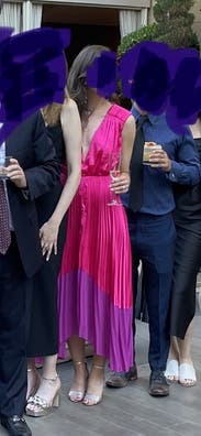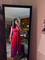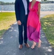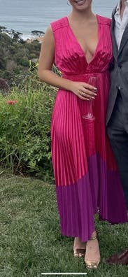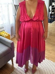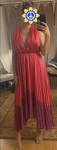 I'm normally not a pleats fan but I loved the vibrant color of the dress and had so much fun in it! It had plenty of room to breathe and was very comfy for a wedding. Only part I didn't love was having to adjust the chest area as the revealing neckline might've been a little too loose. I think some double sided tape would've helped.