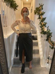 Very bulky on. I couldn’t button it because it was had to tape down the skirt and really cinch in the belt to appear high-waisted. There’s some really good faux leather out there—this is not it, it’s just ok. Notice that the model’s photos are of her walking or in some sort of movement? It’s because the skirt is not the most appealing from the front if you’re standing still.