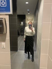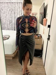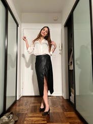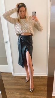 This skirt is amazing!!! One of my favorite rentals ever and I've been renting for 7 years now. The material is ridiculously buttery and the fit on the waist can be slightly adjusted. You can shift the slit accordingly to get the look you want. I loved pairing this with a cropped sweater but it is so versatile and can be paired with so many tops! I wore it with this light brown, lavender, baby blue, light pink and white. Don't hesitate to rent this gem!