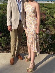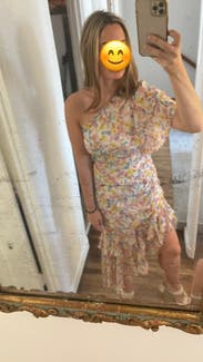 Super fun details; one shoulder and ruffles. Has some rouching detail which makes the form fit super flattering. Gorgeous spring colors. Easy to dance in. Compliment all night long!