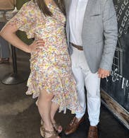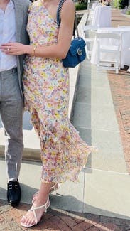 Rented this dress to attend the Kentucky Oaks. Received so many compliments! Dress runs large in the chest and waist. I am a 30F and the dress was still a bit too large on the sides of my chest. Nothing some fashion tape couldn't fix. This is such a beautiful dress for any summer special occasion, it's even prettier in person!