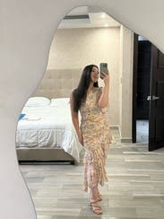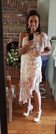 I got so many compliments when I wore this to a friend's wedding! It was easy to dance in and appropriate for a formal ceremony. I loved the ruffles and ruching, but the slit kept migrating toward the back of my leg. It starts high on me, so I had to twist the bottom of the dress around periodically. It's definitely not as comfortable as it looks, but maybe because it was tighter on me around the hip/butt region. I think this would look absolutely stunning (and feel comfy!) on a different body type.