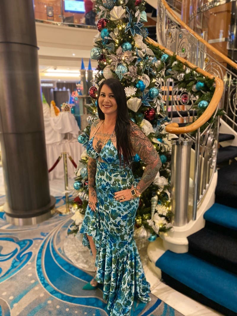 Blue floral print charmeuse (100% Recycled Polyester). A-line. Halter neckline. Sleeveless. Side zipper closure. 56" from shoulder to hemline. Imported.