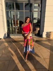 This dress is amazing! Colorful and fits well in all the right places. Rented the purse shown with it as well to tie it all together. Wore regular strapless bra and used one piece of flash tape as a preference to the top. Could have worn boob tape as well, but I’m not as skilled doing that. Comfortable enough that I danced all night in it. Would rent again!