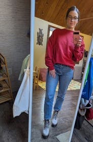 I didn’t know I’d love a simple red sweatshirt so much but I do. It’s an oversized fit - I’m in between a medium and large and have rented both sizes - the large was more dramatically oversized but the medium is still quite baggy and roomy and is my preferred fit.