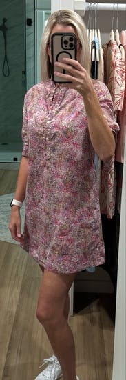 This was the perfect dress for an outing with a friend in the summer. It was a thin dress that felt good in the heat. I love the various shades of pink in it and the flirty high collar. I thought about buying it.