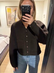 Elevated cardigan. It has great structure which makes it look chic. It’s also surprinstou warm. I’m somewhere between a size 2 and 4, and generally like things a little looser/oversized so I will size up. A size 4 was a bit too big. But I liked the look so much I returned for a smaller size.