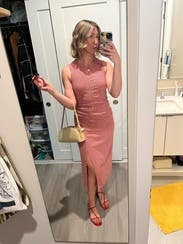 A cute neutral structured bag that works great for date night/weddings/any event. I would not keep this or use this for everyday use- the zipper cut my hand at one point reaching into the bag because it is so stiff. Great to compliment an outfit but not practical