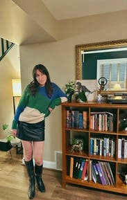 Easy, oversized sweater! I love the pop of color with the blue & green