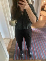 I wore this top A LOT and I’d buy it if it weren’t dry clean only. It may not be the most figure-flattering thing in the world but I got compliments on it and it felt good to wear, which is always a confidence boost. One of my coworkers recommended tucking it in, which would have given me more shape, but I was wearing maternity jeans so that wasn’t gonna happen (I’m hardly showing, but the elastic would’ve shown) - maybe will rent again postpartum!