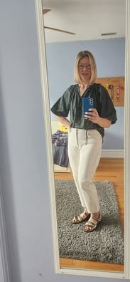 Really liked this blouse! Thought the material was super soft. The arms are quite billowly, so I wish I sized up so the torso was more loose as well.