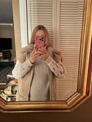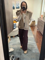 I needed a warm vest for the fall since none of mine currently fit me during my third trimester. This vest certainly works for the cold weather and is an easy throw on piece! It’s heavy and definitely great quality. My one drawback is that it’s very bulky in the shoulders and makes me look broader than I am. I liked it but didn’t love it.