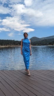 I rented for a night out with my company. I didn’t end up wearing it though because it was too cold out. As others reported it is tricky to figure out how to put on at first. I had to look at the RTR Model multiple times to figure it out. But once you get it, it’s easy. Beautiful blue color. My nice d said it looked a bit too draped, like Roman times but I still liked it. The 10 was a bit too tight in me, and 12 was a bit too loose. But I would have gone for the 12 as I think it looked better.