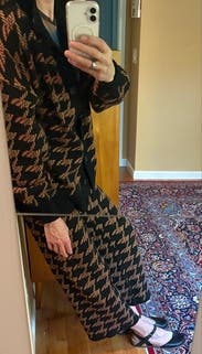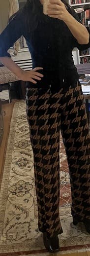 Like wearing pajamas to work … but polished! I am usually a size 12 in pants and the large fit me perfectly. A tad too long on me @5’6” but worked fine with a loafer with a slight heel. Will definitely rent again, hopefully, next time with the matching sweater!