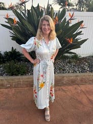 Loved this elegant floral dress. The fabric is a satin and I didn’t have any issues with it being sheer like other reviewers. Wore to a November date night by the beach and it took me back to summer vibes. Will definitely rent again.