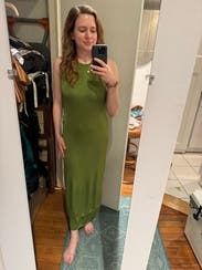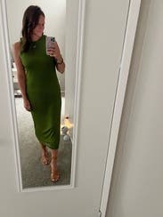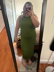 Perfect slip dress for spring. Dressed it up with heels for a shower and down with sneakers for dinner later that night. I’m 5’3”, apple shapes with a tummy and this fit perfectly. Material is forgiving.
