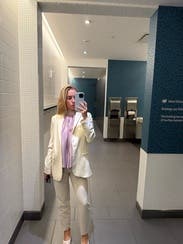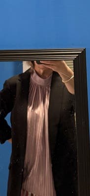 I wore this with a black blazer and dark jeans to work and it elevated the outfit. A beautiful lavender color. Easy to wear, and perfect to rent so you don't have to mess with the pleats you can just send it back :) Will rent again.