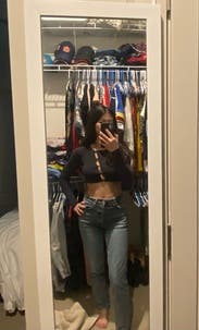 Reallly cute but definitely more cropped than I expected and with more space between the buttons resulting in a very revealing shirt! underboob and sideboob galore! It's a lot to take in but great for a night out, I also wore it under overalls for a daytime look. The material is ribbed so it's conciliatory in other ways but not that comfortable. Temp is also weird since it's a warm material but so much skin is exposed.