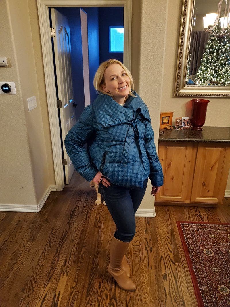 Blue check printed polyamide (100% Polyamide). Jacket. Long sleeves. High neck. Hidden front snap closure. Tie at neckline. Fully lined. Side pockets. 21.65" from shoulder to hemline. Imported.