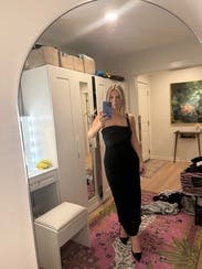 Pardon the two shoes - was trying it on & this was the only full bod pic I got in it LOL Beautiful dress. Felt so elegant. Was snug - but I was my normal size in it…maybe if you’re between sizes, size up or get two size options