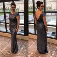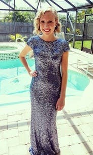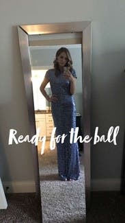 This dress will definitely turn heads. With the sparkle, I felt stylish and elegant. It was a little fitted but the fabric did have stretch. Since it had stretch, the size 0 was perfect for me. I loved how the front was classy with the high neckline, but you still could show skin with the exposed back. It was a bit long on me due to my height, but with higher heels it would have been fine.