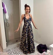 Wore this to a wedding and got multiple compliments! Dress is navy with gold. Wore flats and dress just barely brushed the floor (5’6”). Deep V so couldn’t wear “normal” bra but wore stickies.