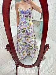 I got lots of compliments on this dress. Very structured and felt high quality. It fit a little snug on me, but honestly helped keep the dress up since it's strapless. Would rent again!