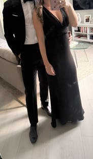 Black crepe (98% Polyester, 2% Spandex). Sheath. Sleeveless. V-neck. Back zipper closure. 56" from shoulder to hemline. Imported.