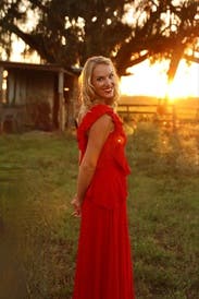 Beautiful high quality red dress - wore to a wedding. I received so many compliments on the color and style! It's definitely a lot of material, but was able to comfortably dance and enjoy the evening!