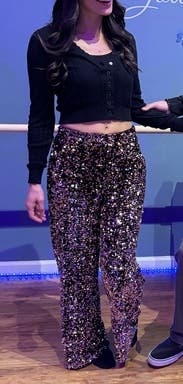 Loved these pants!! Wore them for a sparkly themed bachelorette and felt like a spice girl wearing them. Normally I’m hesitant to wear sequins because of the discomfort but these pants were lined well and super soft inside. Putting them on makes your outfit instant fun. Also true to size