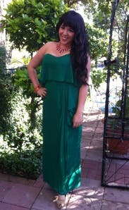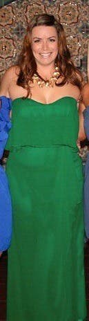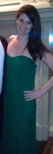 This dress was a beautiful bright green color and very easy to wear. I wore it to a black tie wedding and loved how it was a simple silhouette but stood out by not being black. The only drawbacks are that it ran small, I am usually a 4 or a 6 and the 8 barely zipped over my chest (32C). This wasn't all bad, since I didn't have to wory about it falling down at all. I also noticed that, when the camera flashed, the gown was a bit sheer over the legs and that you can see the subtle sweat stains below the arms. You couldn't see them in "real light" but I can't share the photos of me from the side.