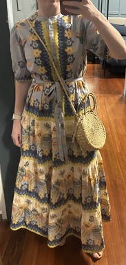 Banjanan “Saylor” Dress brings fresh energy for sunny days with its vibrant prints and breezy tiered skirt that falls gracefully from a cinchable waist. Slip on block-heeled sandals and toss in a woven tote for an effortlessly polished day-out look.