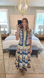 Great summer dress. I wore this twice. Once out to dinner and to work. It’s long so more of a maxi. Really pretty fit and feminine details.