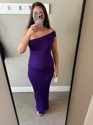 Lovely, easy to travel with slinky and comfy fabric, bold color, just not suited to my color-palette (and maybe height too). For someone a little taller that looks great in bold purple, this is the dress!