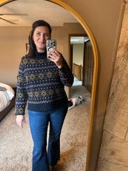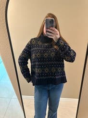 The longer back hem is flattering. Nice neckline. Warm sweater. Medium was generously sized for me (I’m a medium), but small probably would have been too small. Super cute with jeans and boots.