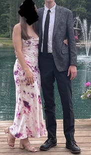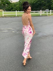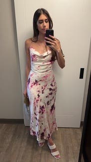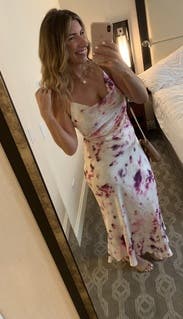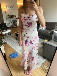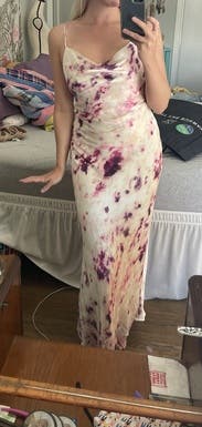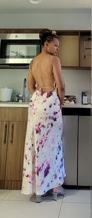 I love love love this dress! The open back makes it super elegant and fun but so does the purple tie die print! Silk fabric is a fun touch as well and great for hot weather. Absolutely recommend just be careful bending over since the cowl neck can be revealing!!