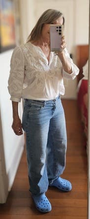 This shirt is very pretty, and the light cotton fabric makes it super comfortable either as a layer under a jacket, tucked in to pants, or where you want full coverage with breathability. The lace design is sewn on across the entire top (including the back!) and sleeves, and the shoulder puff is feminine but not costumey. For a similar style, the Vanessa Bruno bell top has a lot of these features - and personally I liked the fancier lace and the drapey knit (and torso length) of that other shirt better, but some of the reviews for that found the Vanessa Bruno too boxy in the torso - this shirt has a more fitted torso so you may prefer that aspect. Great, versatile piece! My rating approach: (5=LOVE LOVE; 4=Will rent again, a couple of details I would change; 3=Works but meh; 2=Won't rent again, but may work in some cases; 1=This should be burned). I am on RTR to try new styles and find sizes for my post-menopausal weight/body shape.