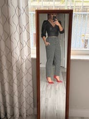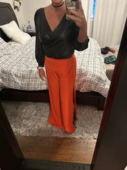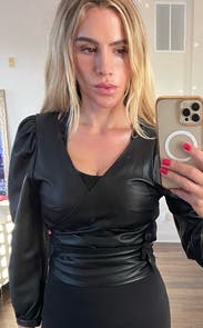 This pleather top is super easy to wear, I wore it out one night and it’s a bit busty and then wore it with a tank for a day at the office. Easy with jeans or knit pants, etc