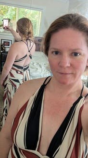 This dress is all about the back! The material was think and flowy enough for a hot summer day albeit a bit sheer on the cream colored areas. I would have given this 5 stars except I feel like those with smaller chests or maybe boob jobs would do better here… I kept having to adjust the girls ever so often, despite the tie being tied perfectly behind my neck the whole time.