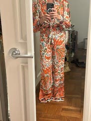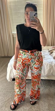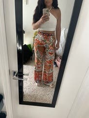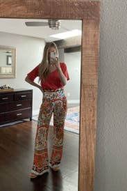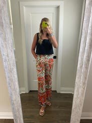 The print is beautiful, but the fit is the best part about these pants. Your booty will look soooo good! The waist runs a touch on the larger size, so if you’re on the fence, size down. The material is extremely light, great for warm spring and summer weather! Wish I rented the matching top! Loved these so much!