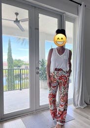 I had such high hopes for these pants I even bought another spot for them! I wanted to wear them on a trip to Mexico. I thought the material would be rich and silky but instead it is crepey and clingy. It really clings especially to the hips and butt. Ultimately I wasn’t comfortable in them so didn’t wear them which was a bummer because the colors and pattern was amazing.