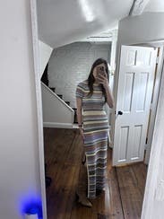 Loved this beautifully striped mesh knit dress and wore it so many times I decided to buy it. Super comfortable (you need to wear a slip of some kind underneath) and perfect for travel. Took it to Italy and got many compliments from design experts there!