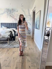 The ba&sh Tonnie Dress is a vibrant, multicolored striped midi that offers a flattering fit with its side slit and ribbed knit design. Pair it with neutral sandals and a woven tote for a stylish yet relaxed daytime look.