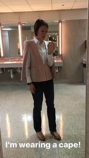 I am a meteorologist and wore this on air. Most people couldn't handle the fashion of the cape! My News Director wouldn't let me wear it again - thankfully, it was rented! I loved it. It's very fashion-forward.