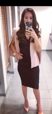 I rented this and wore it to work on valentines day, and then later that evening for date night with my husband. I got SO MANY compliments. The hook closure made the jacket fit my body like a glove, but I liked the option to keep it unhooked if I didn't want the jacket to be so form-fitting in front of co-workers. Very comfortable to wear all day!